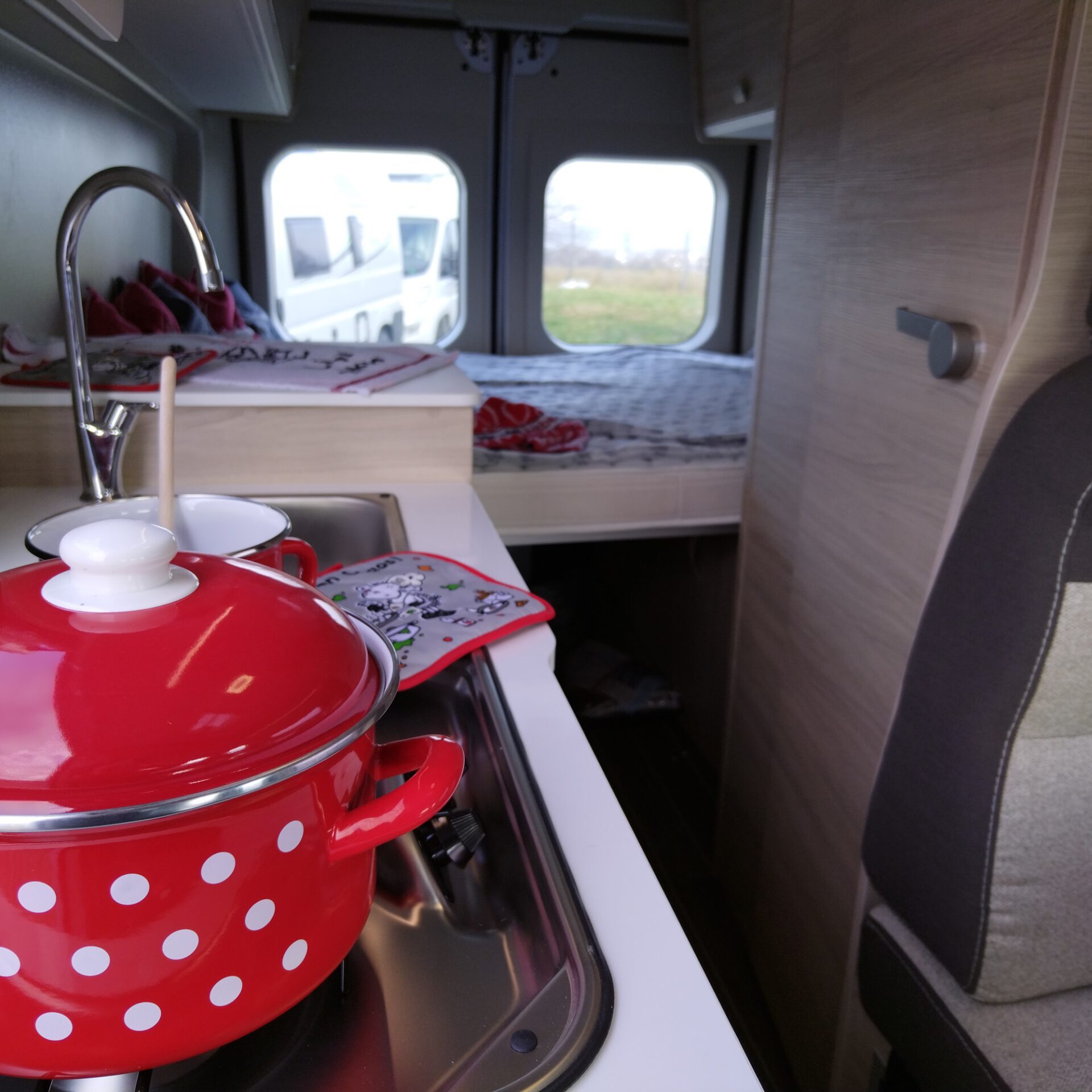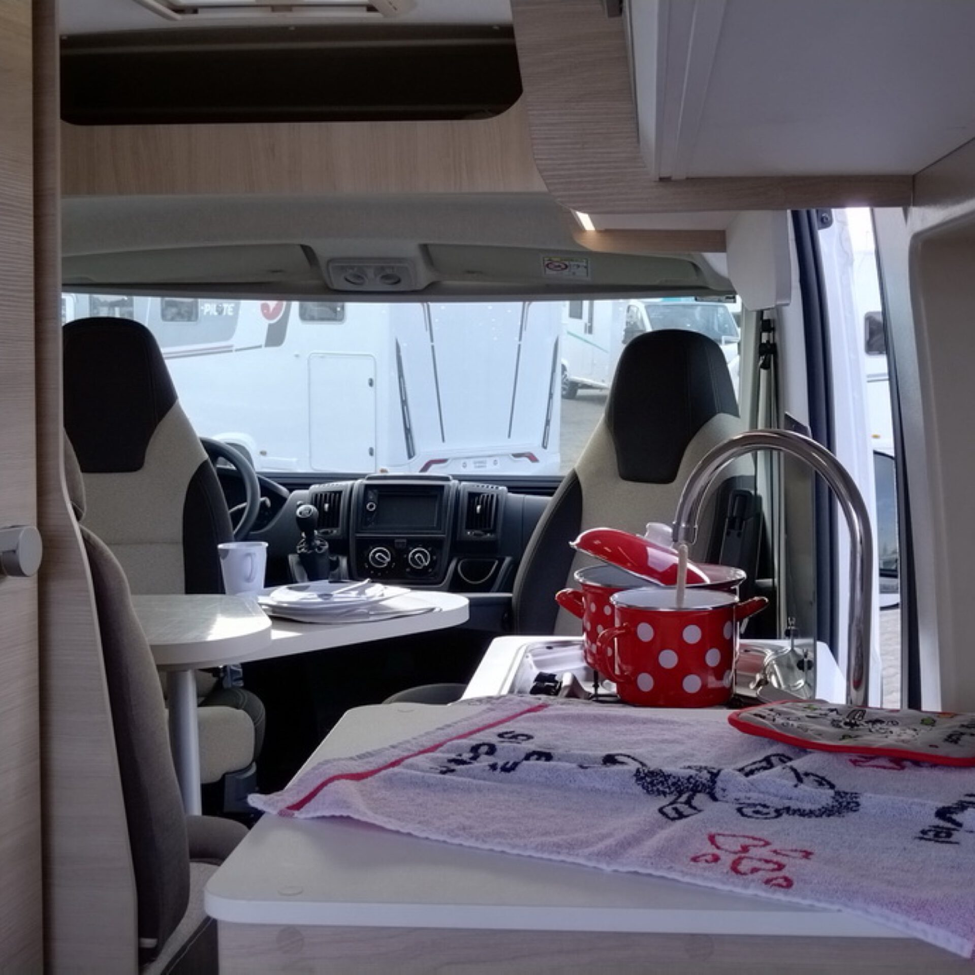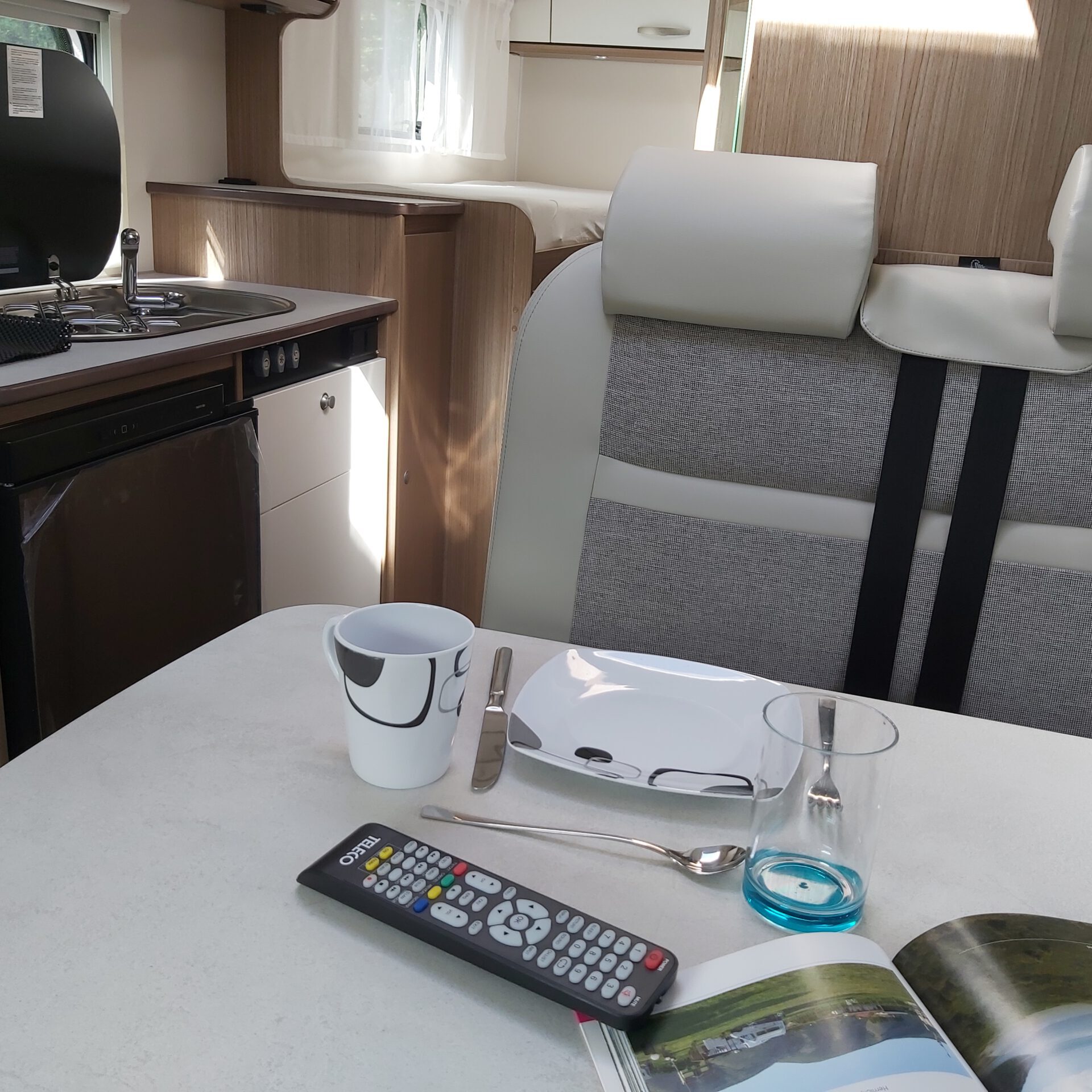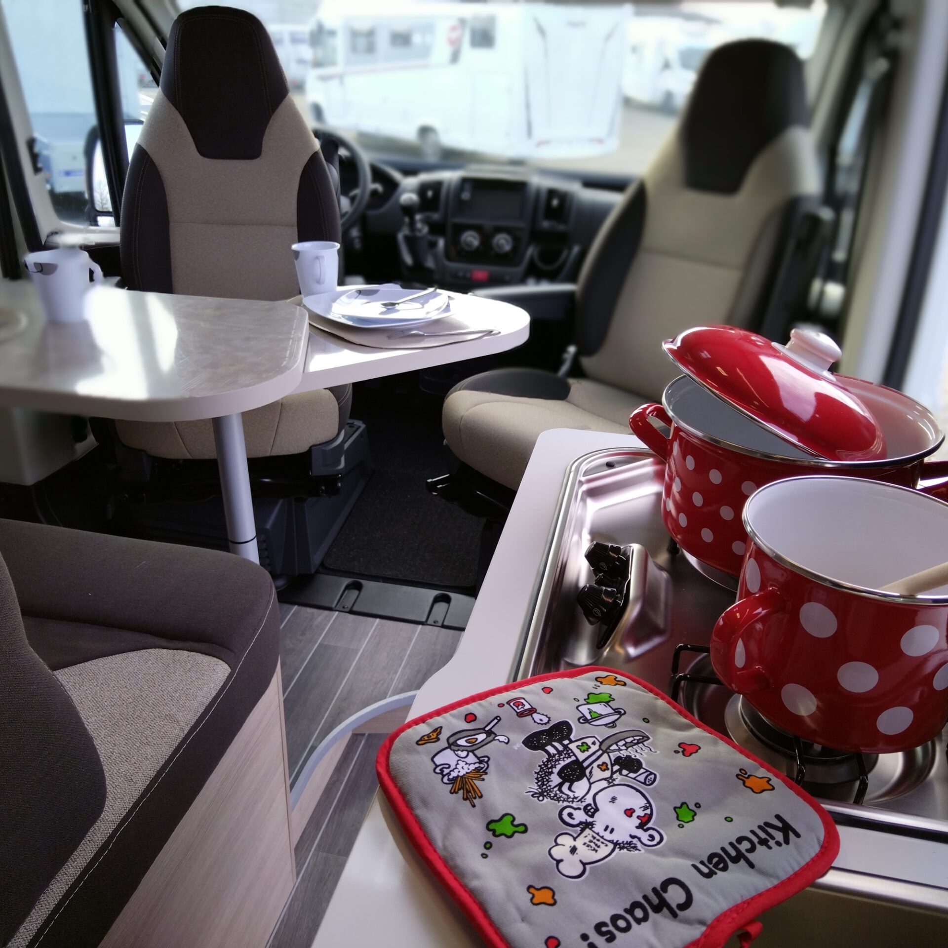 Die komplette Ausstattung von Geschirr, Kochtöpfe, über alle Camping und Versorgungsartikel bis hin zum Fernseher und Markise.