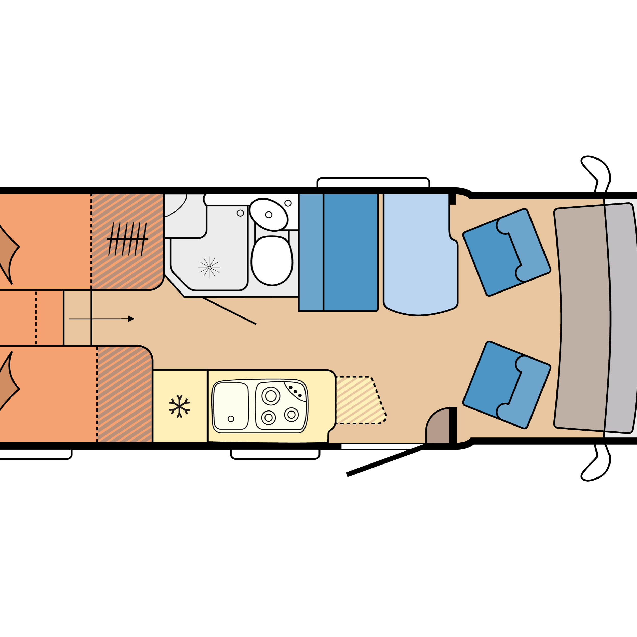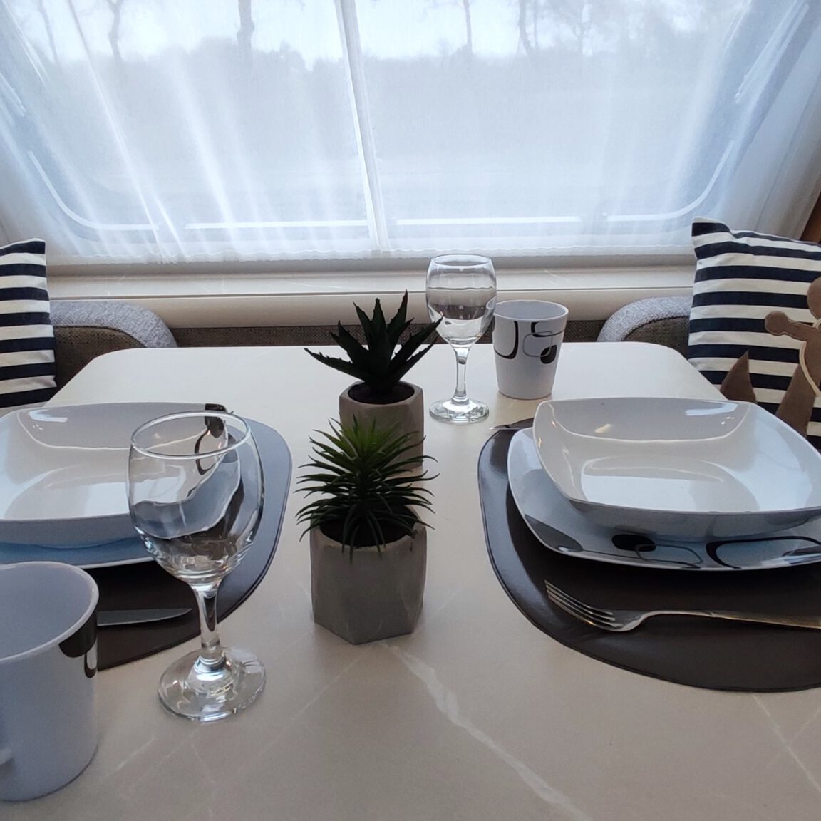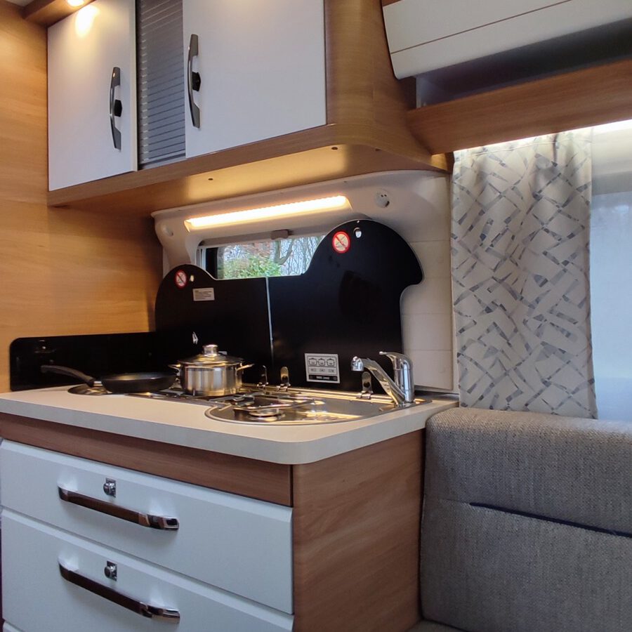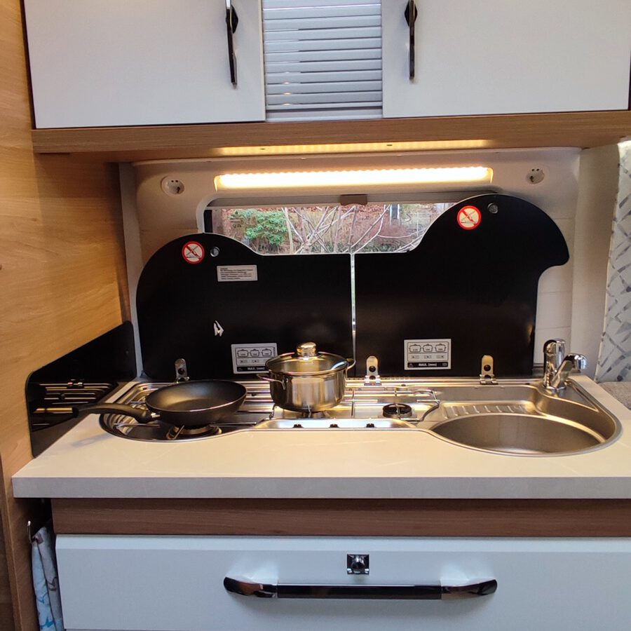 Die komplette Ausstattung von Geschirr, Kochtöpfe, über alle Camping und Versorgungsartikel bis hin zum Fernseher und Markise.
